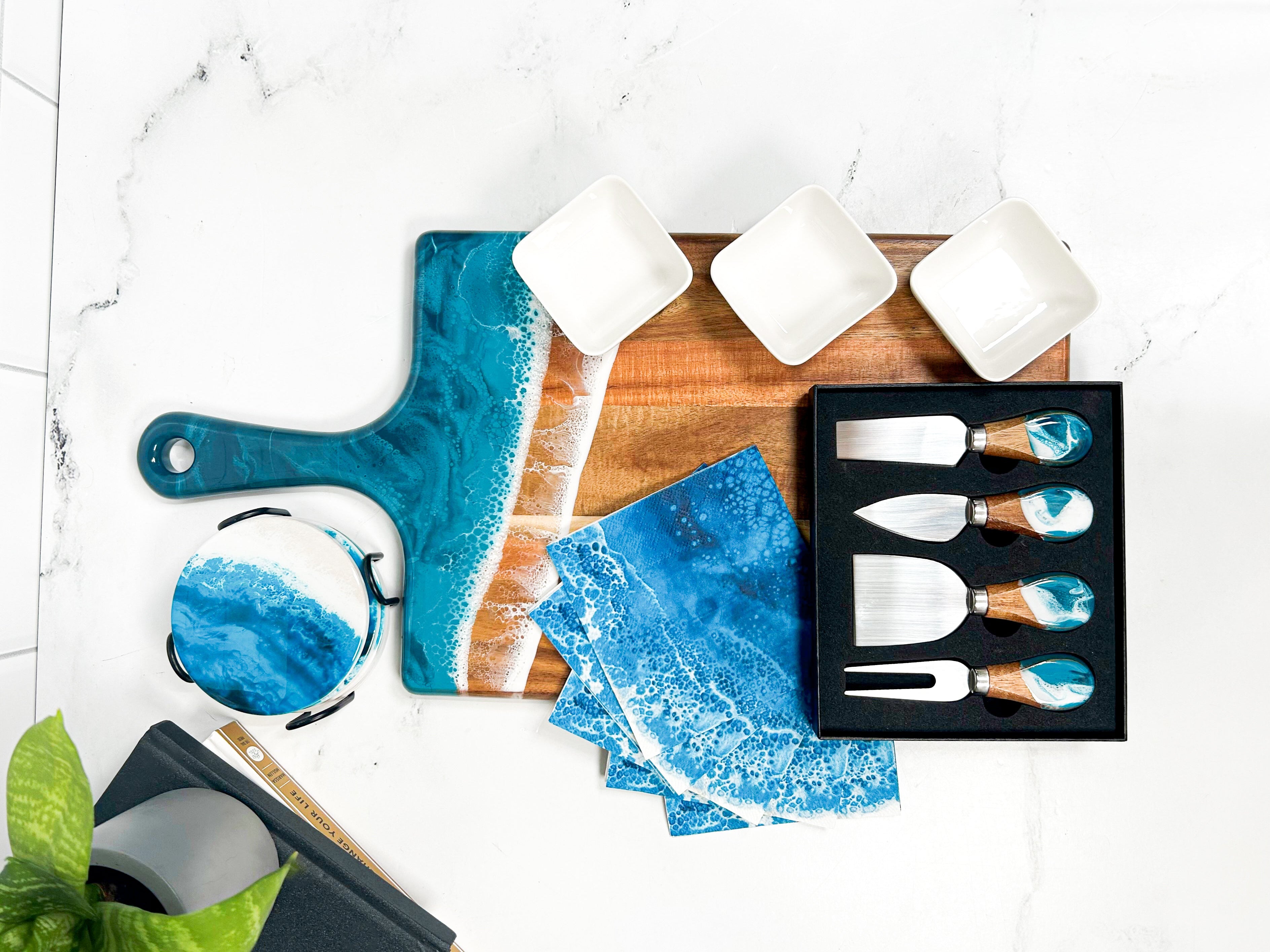 Serving your food on a resin-accented cheese board will elevate your presentation to a whole new level! Truly unique serveware can be difficult to find. We believe that you should have serveware that you can confidently place down in front of the most discerning guest, which is why we challenged ourselves to create something stunning out of an ordinary cheese board.