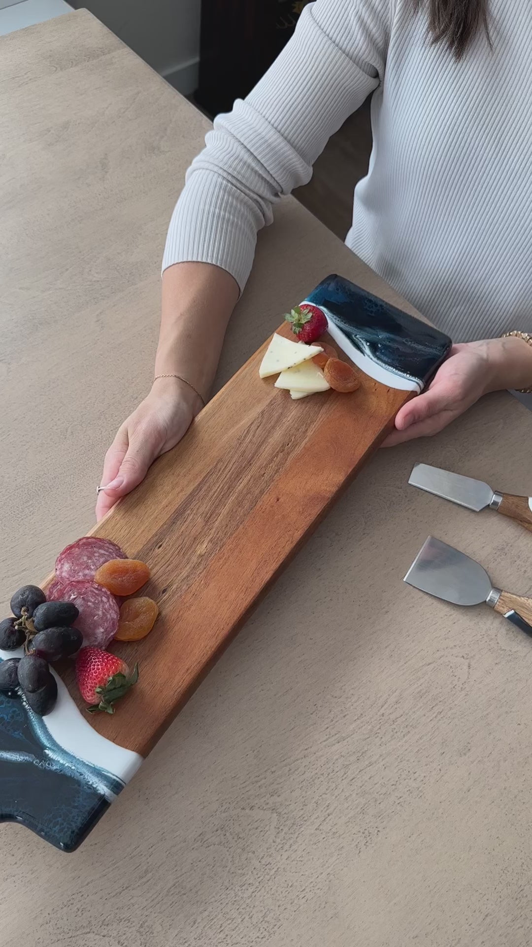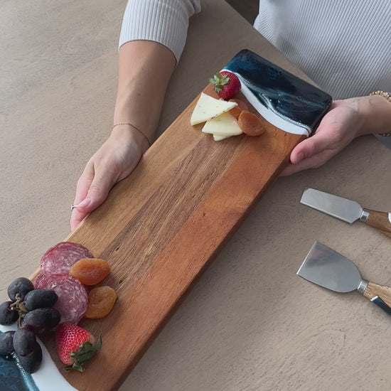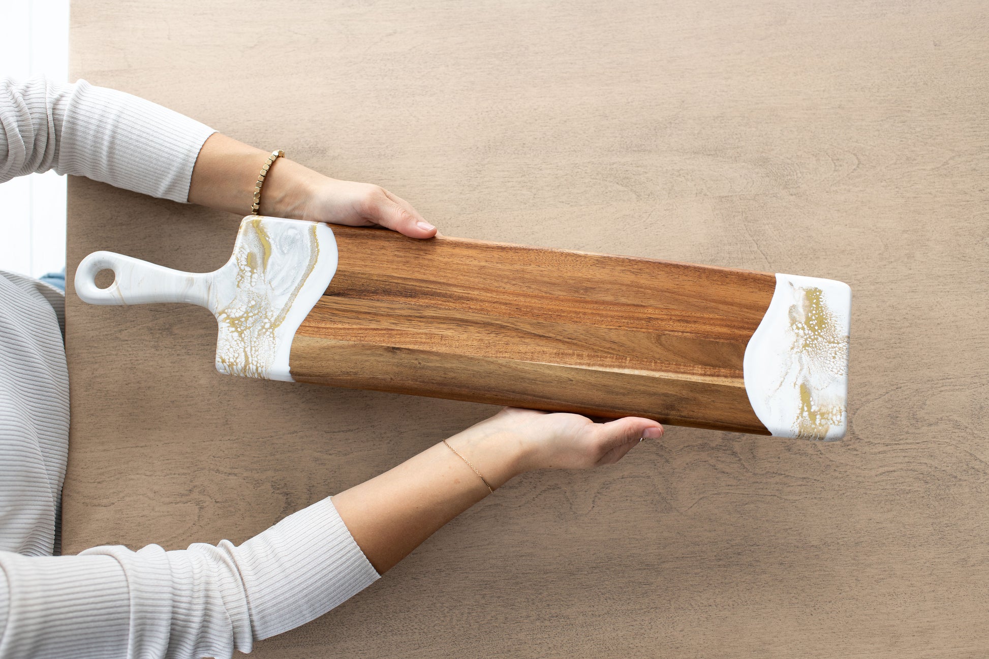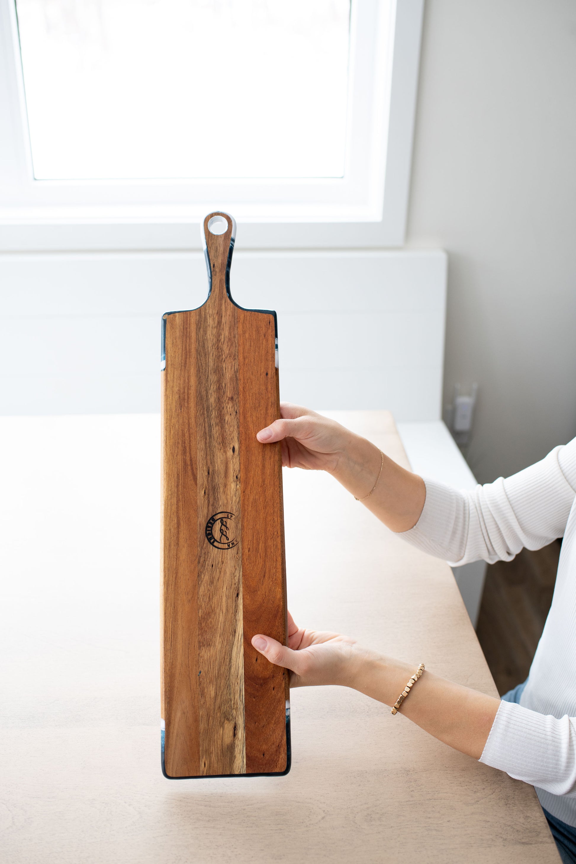 These pieces blend gorgeous Acacia hardwood and an eco-friendly resin to create a one-of-a-kind piece of serveware for your home. These baguette boards are perfect for serving a group of 3-5 people.