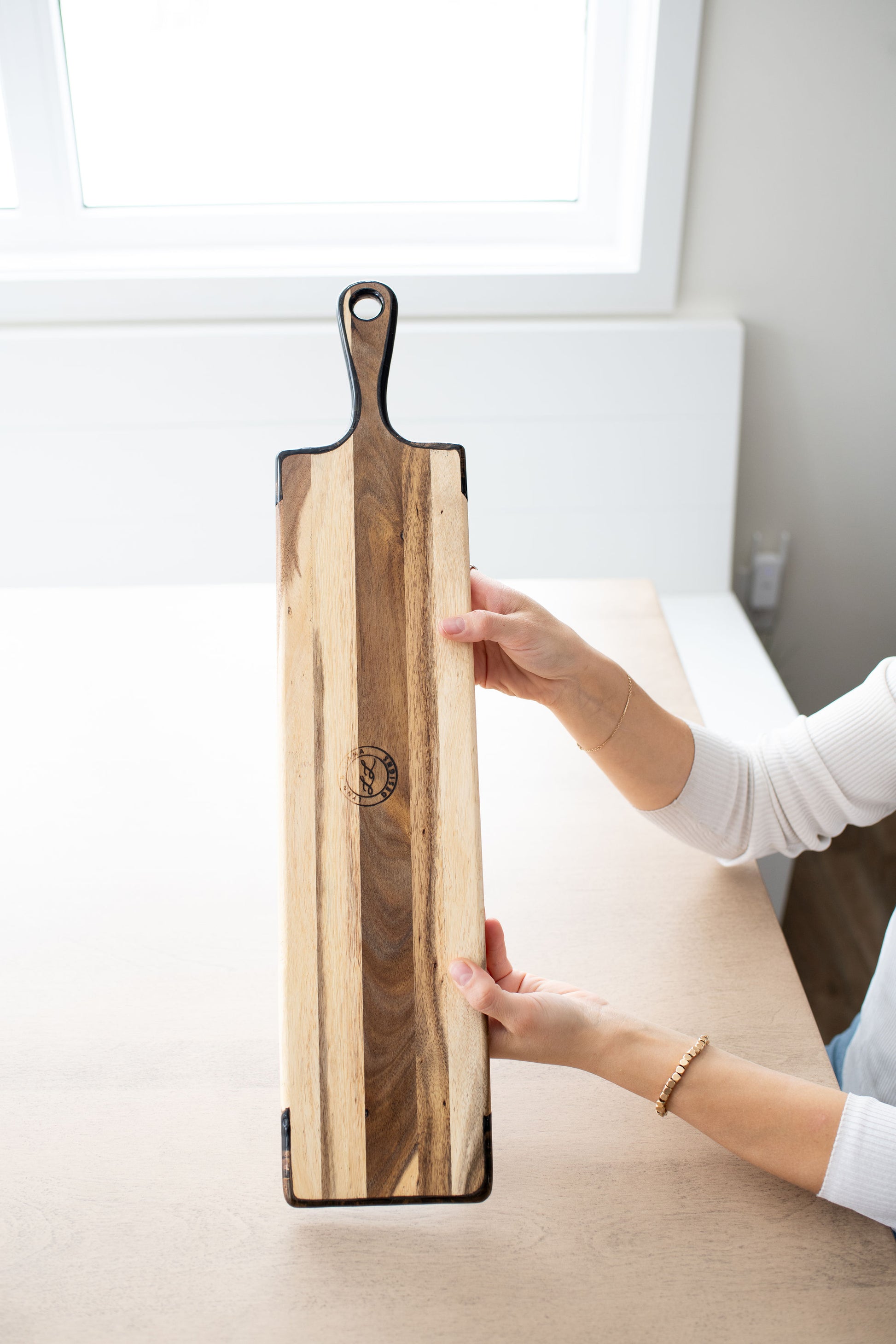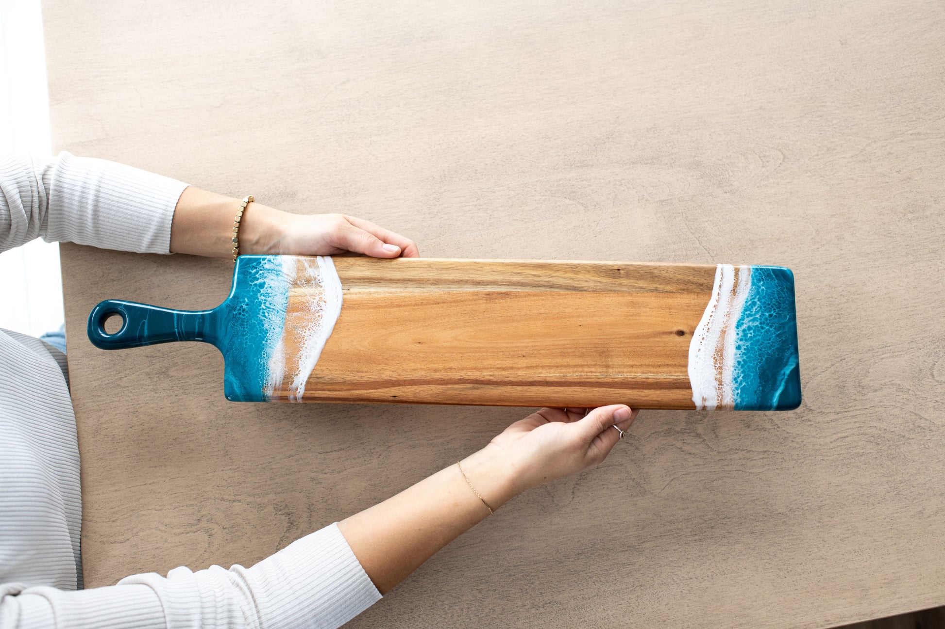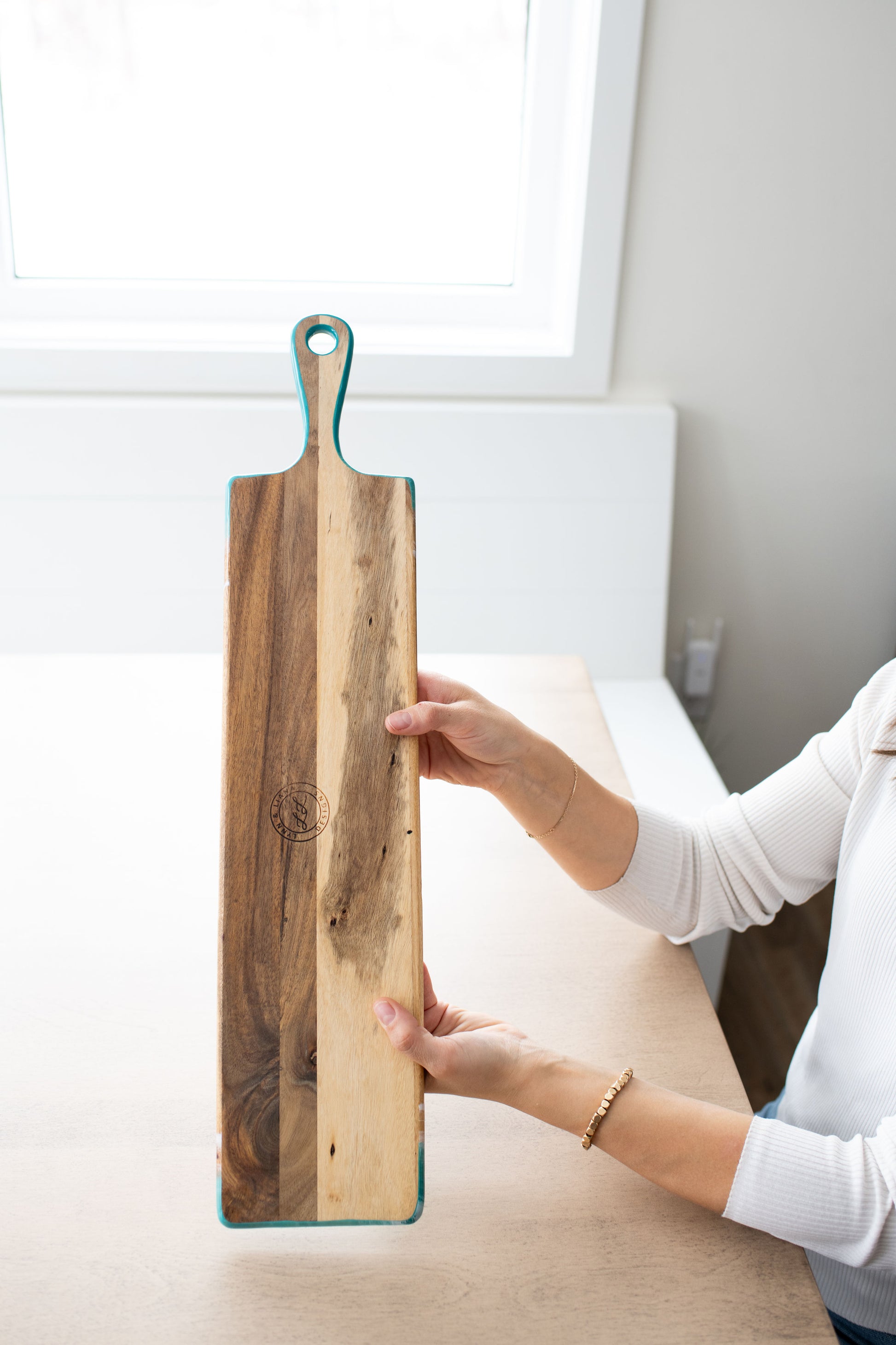 These pieces blend gorgeous Acacia hardwood and an eco-friendly resin to create a one-of-a-kind piece of serveware for your home. These baguette boards are perfect for serving a group of 3-5 people.