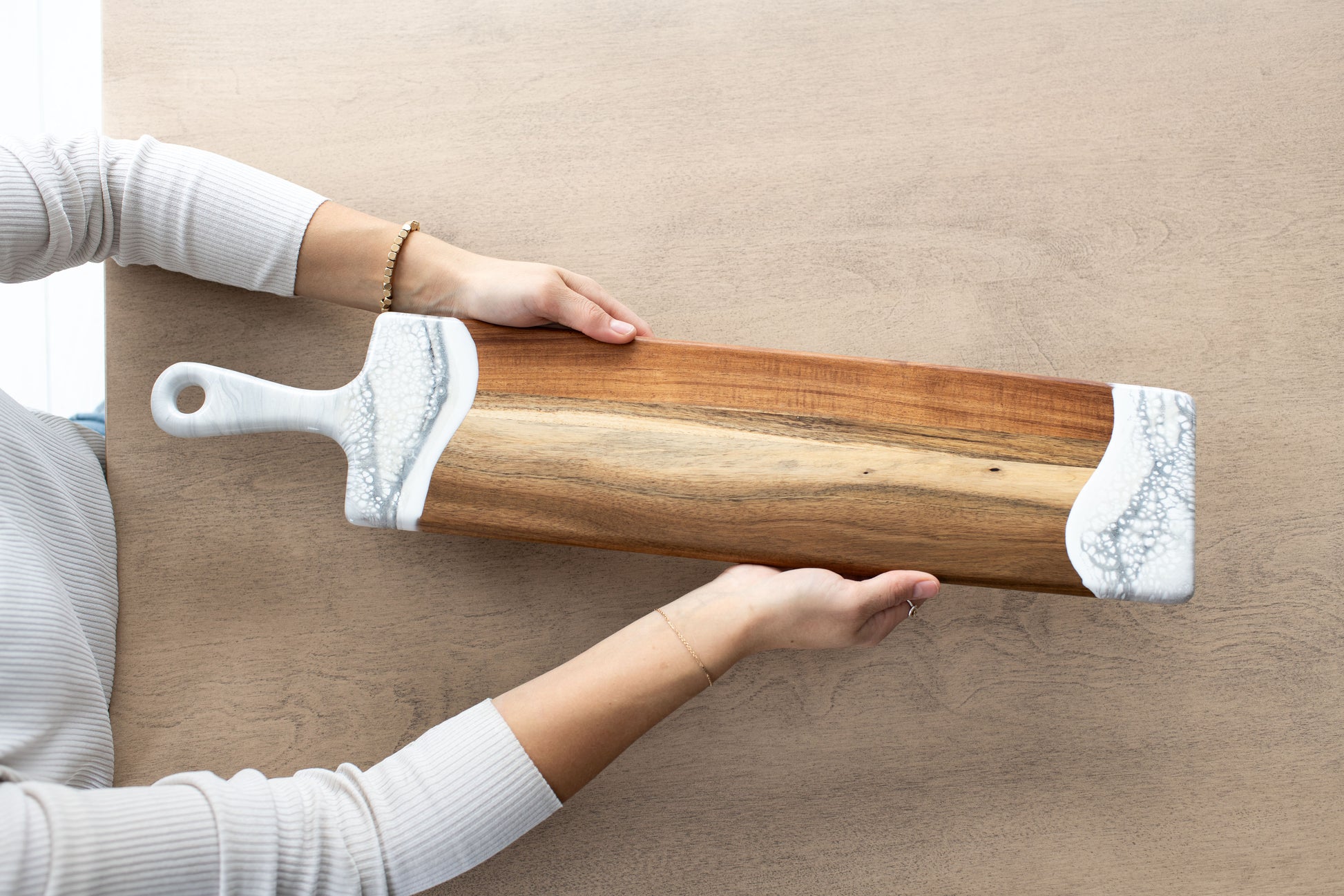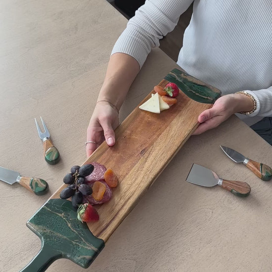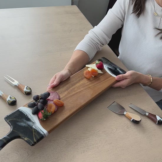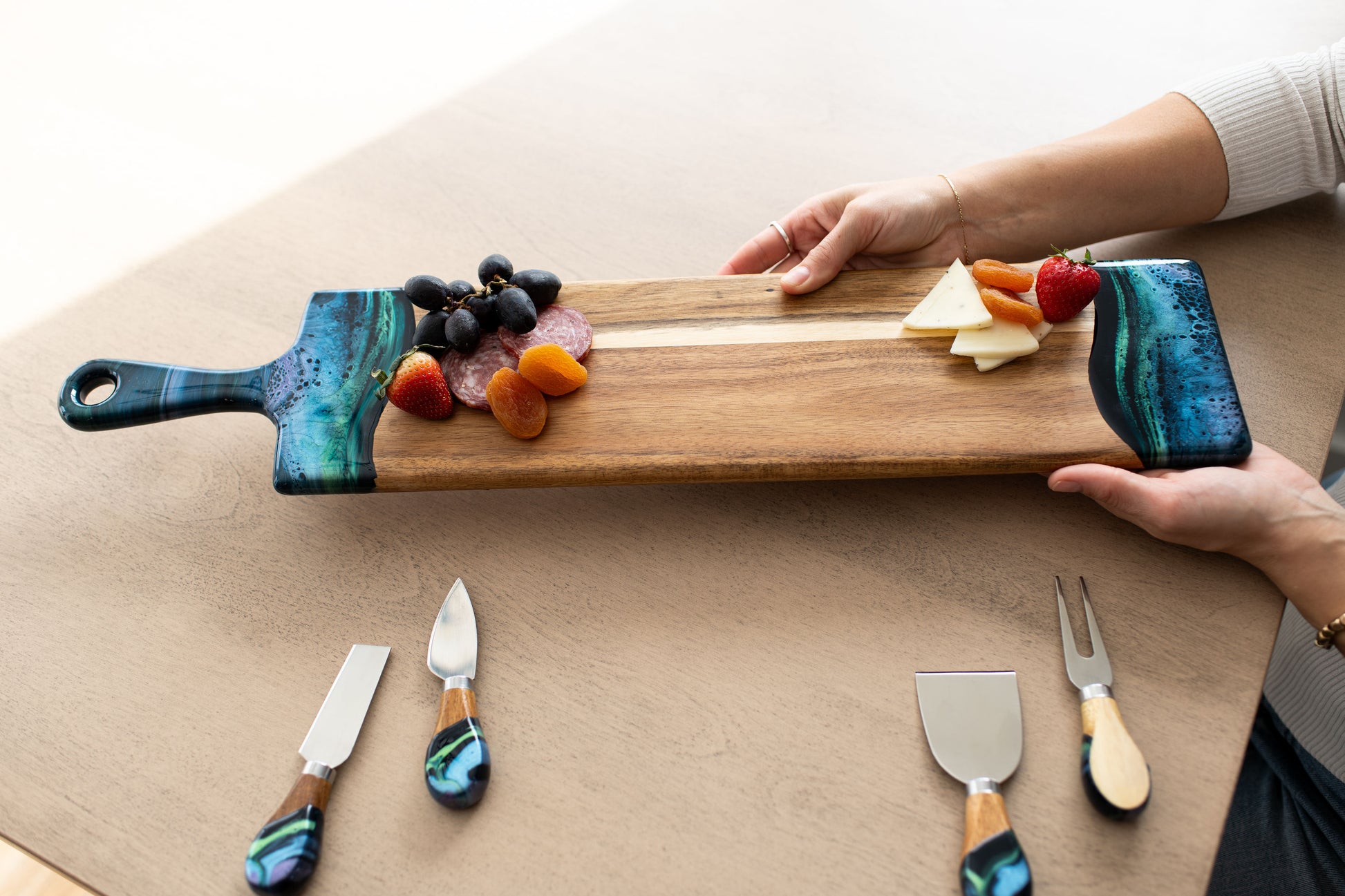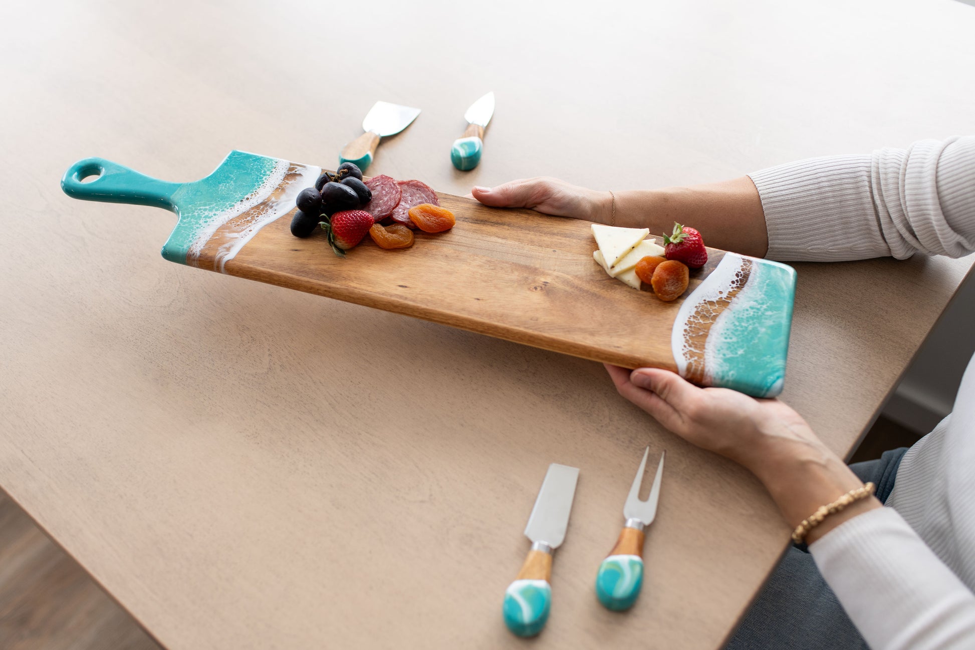 Here’s a great suggestion from one of our customers: If you want to use one of our cheese boards as a cutting board, use the back of the board for cutting and the front for serving. The resin portion could scratch if used for cutting.