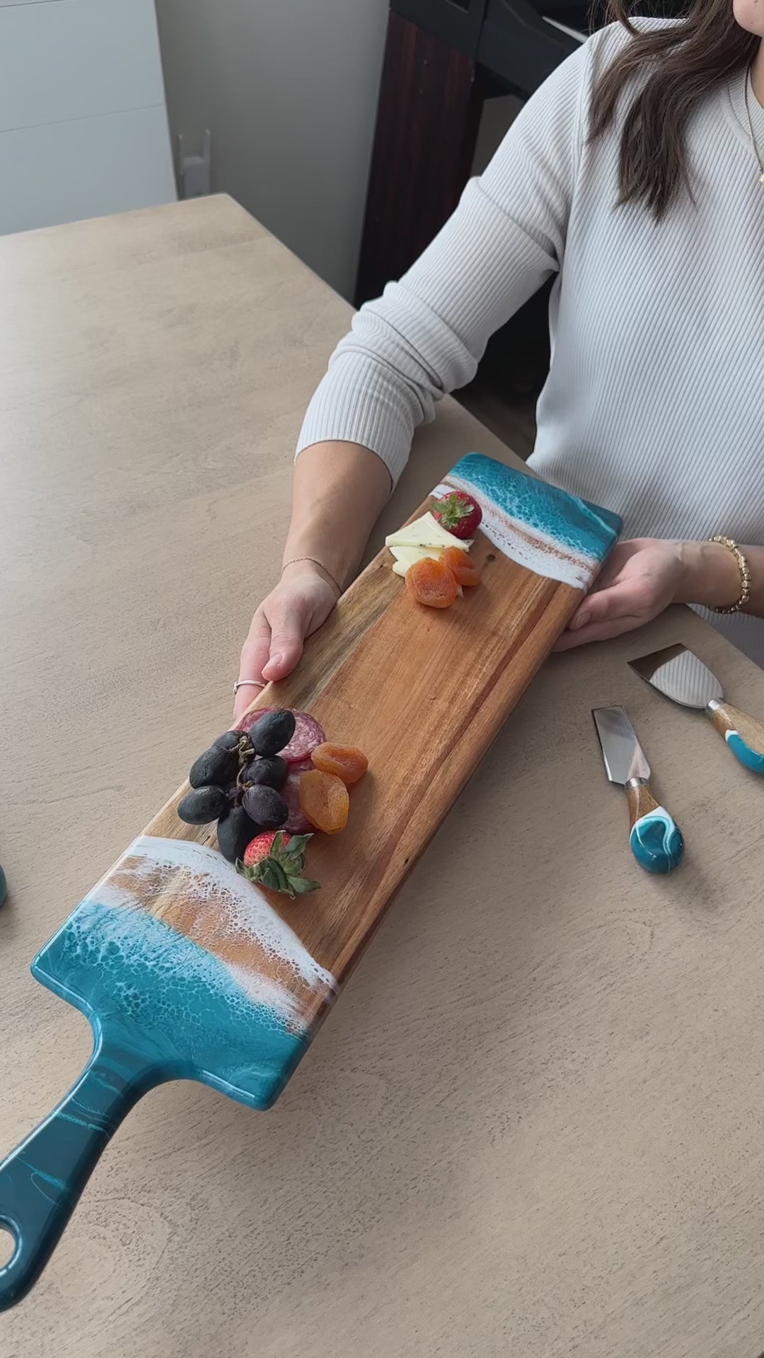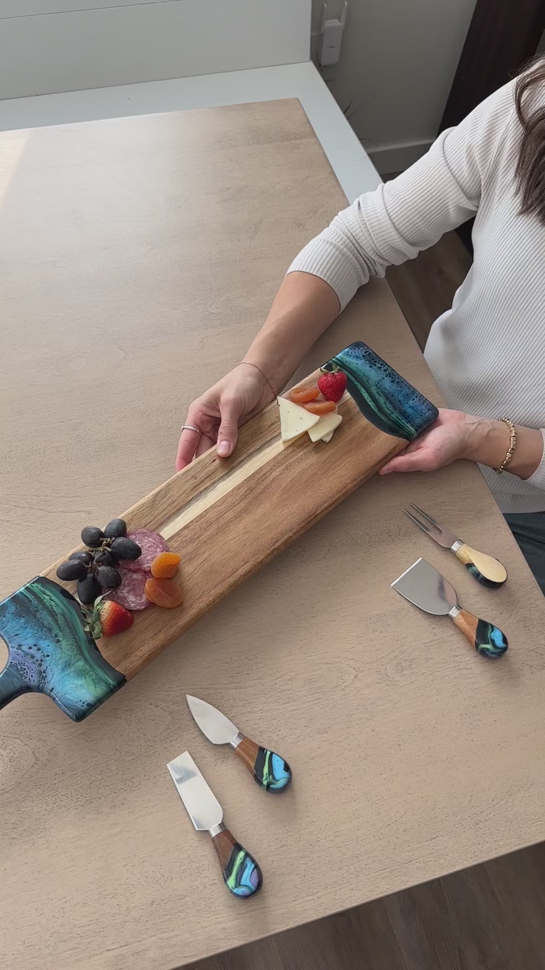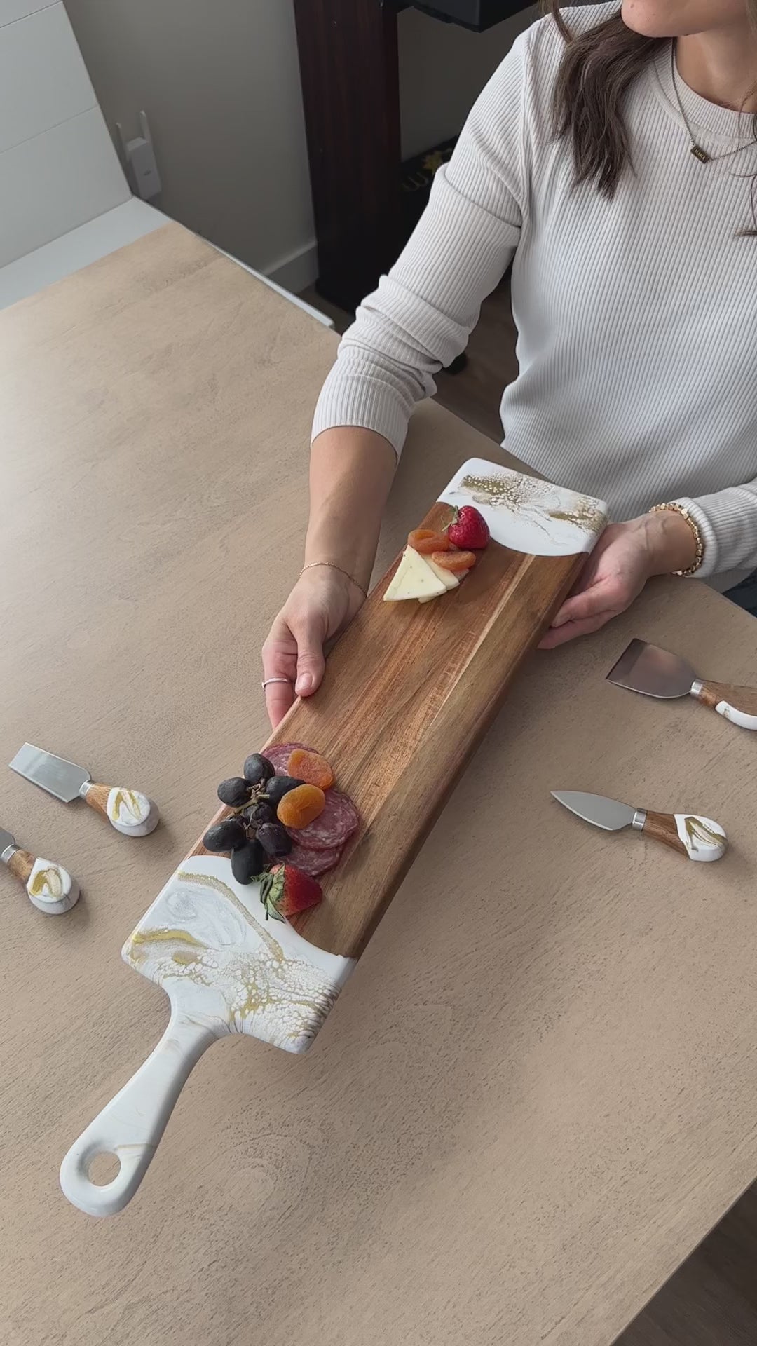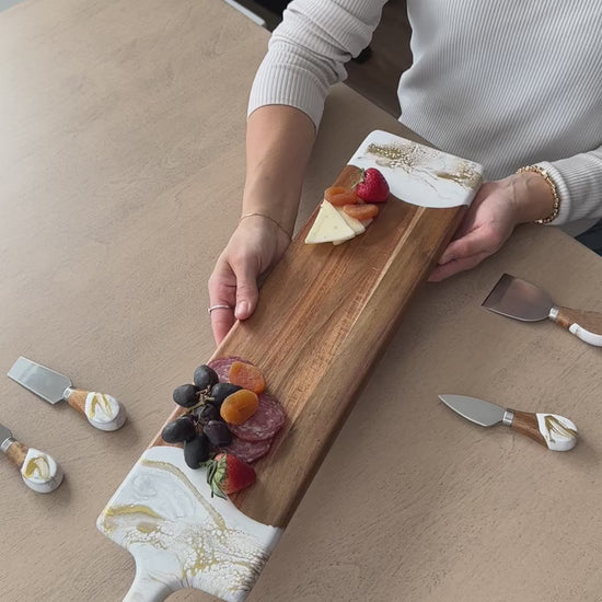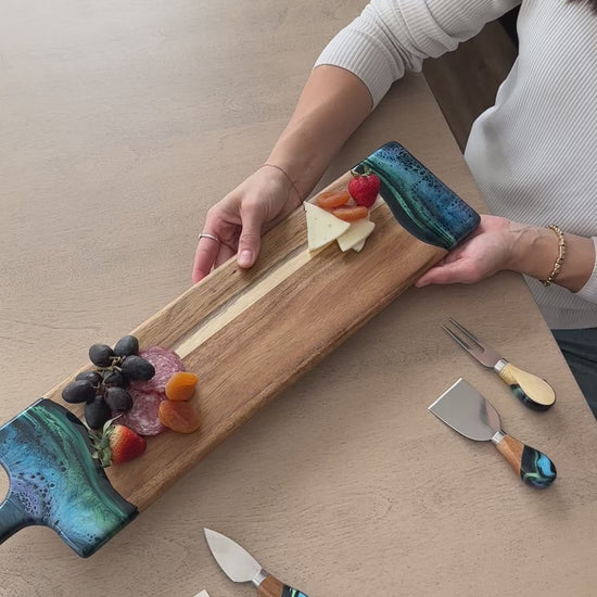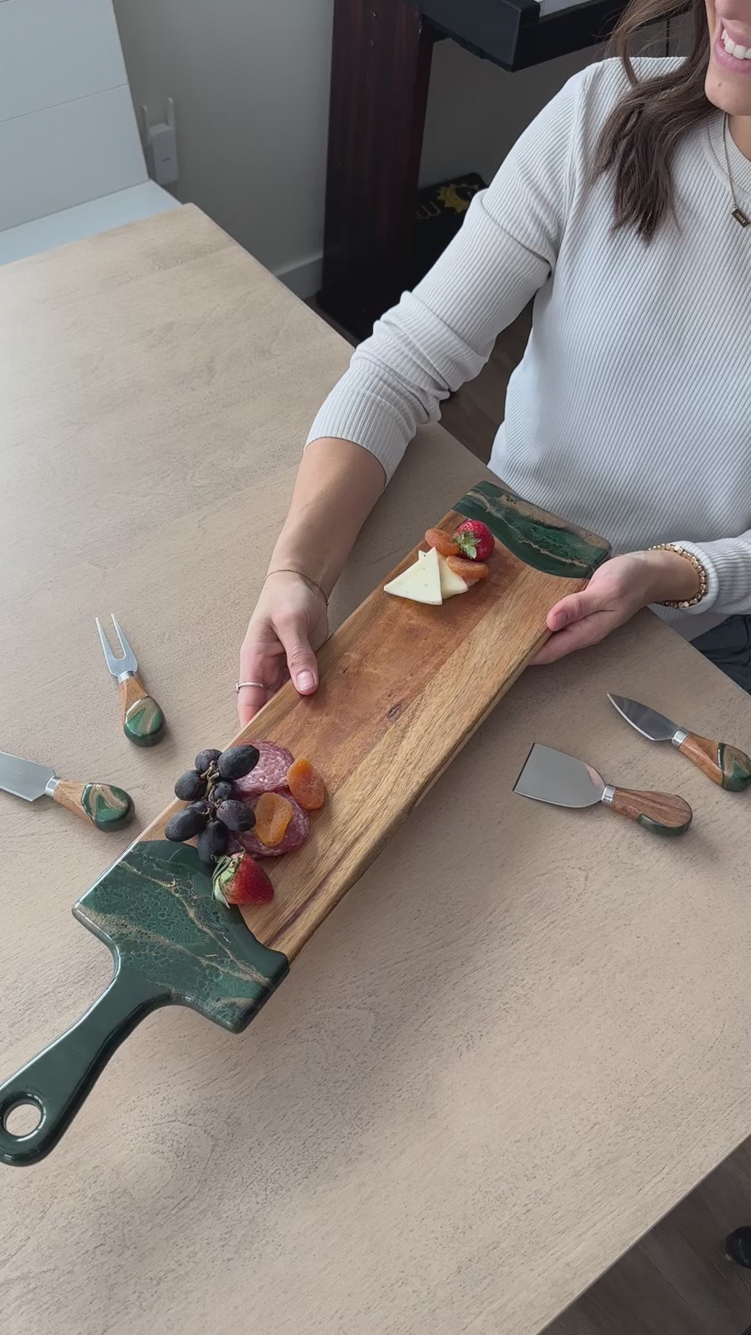 Here’s a great suggestion from one of our customers: If you want to use one of our cheese boards as a cutting board, use the back of the board for cutting and the front for serving. The resin portion could scratch if used for cutting.