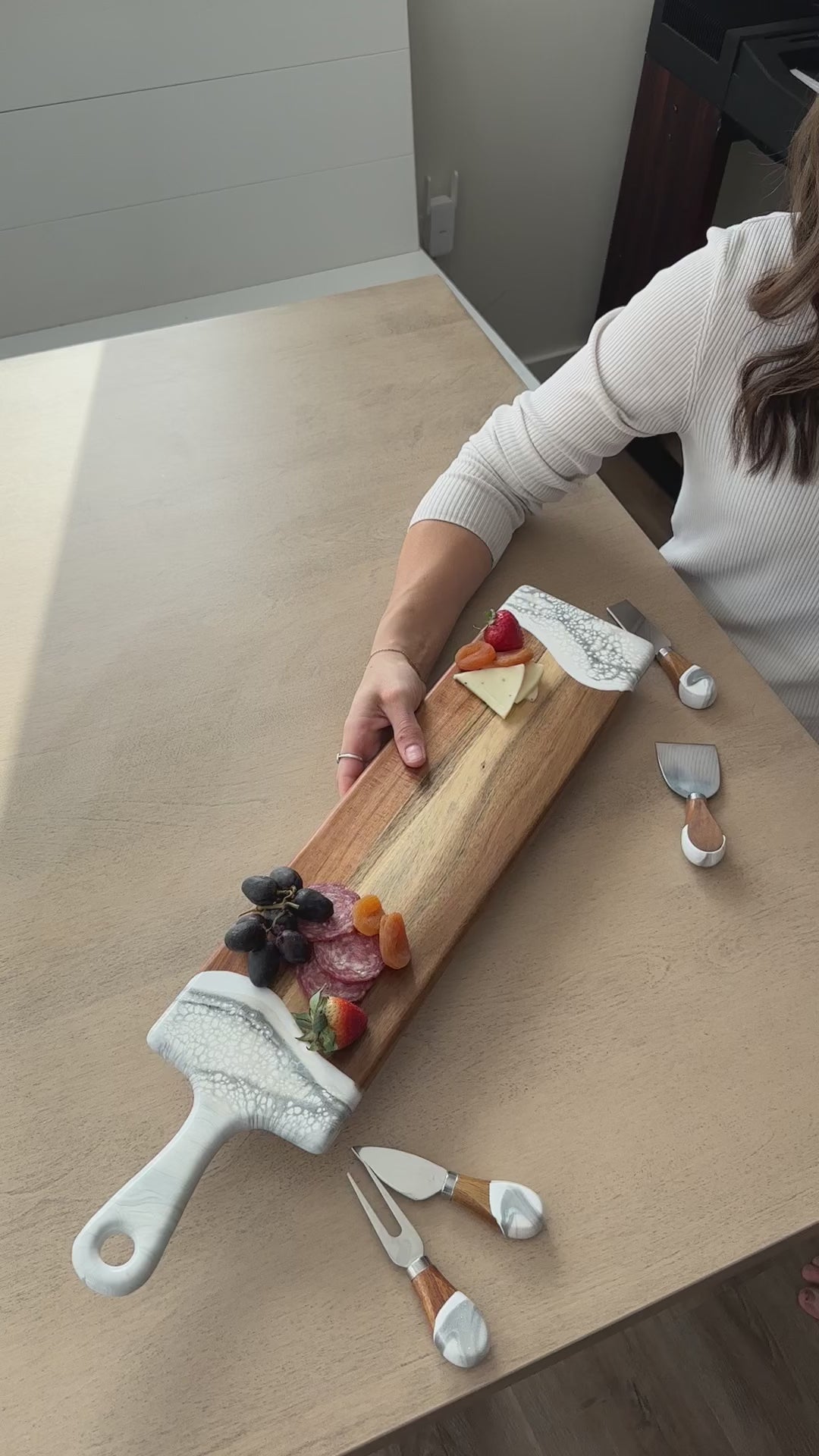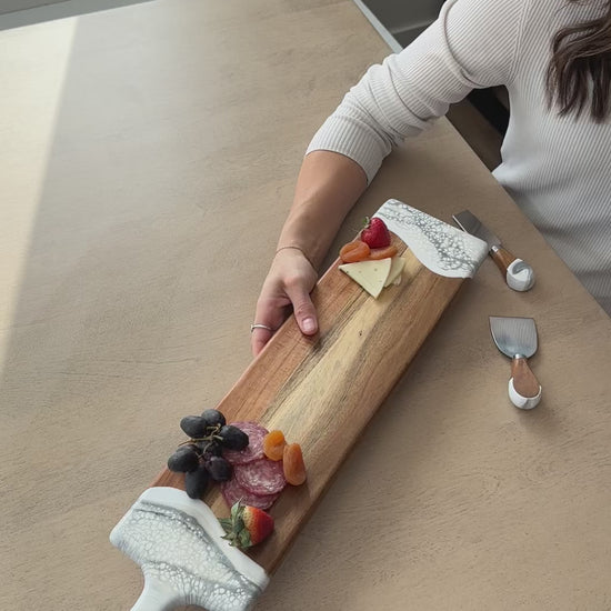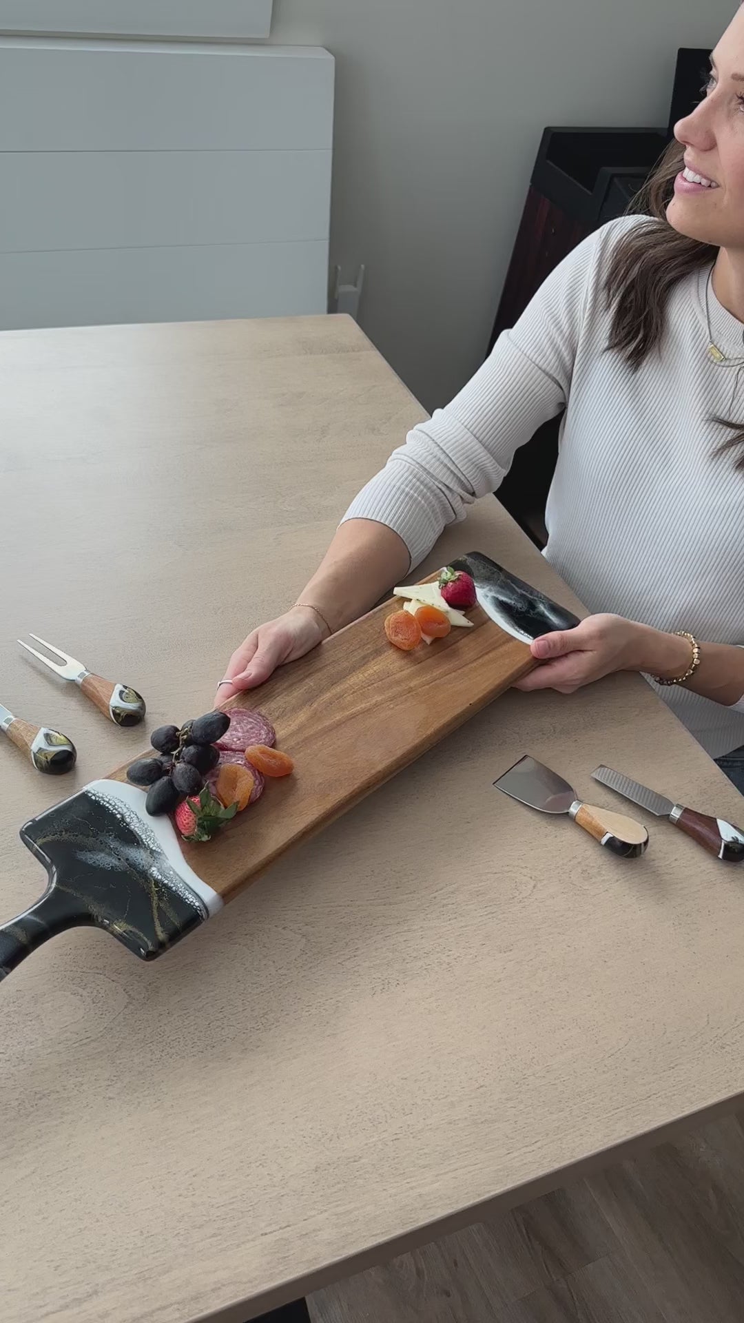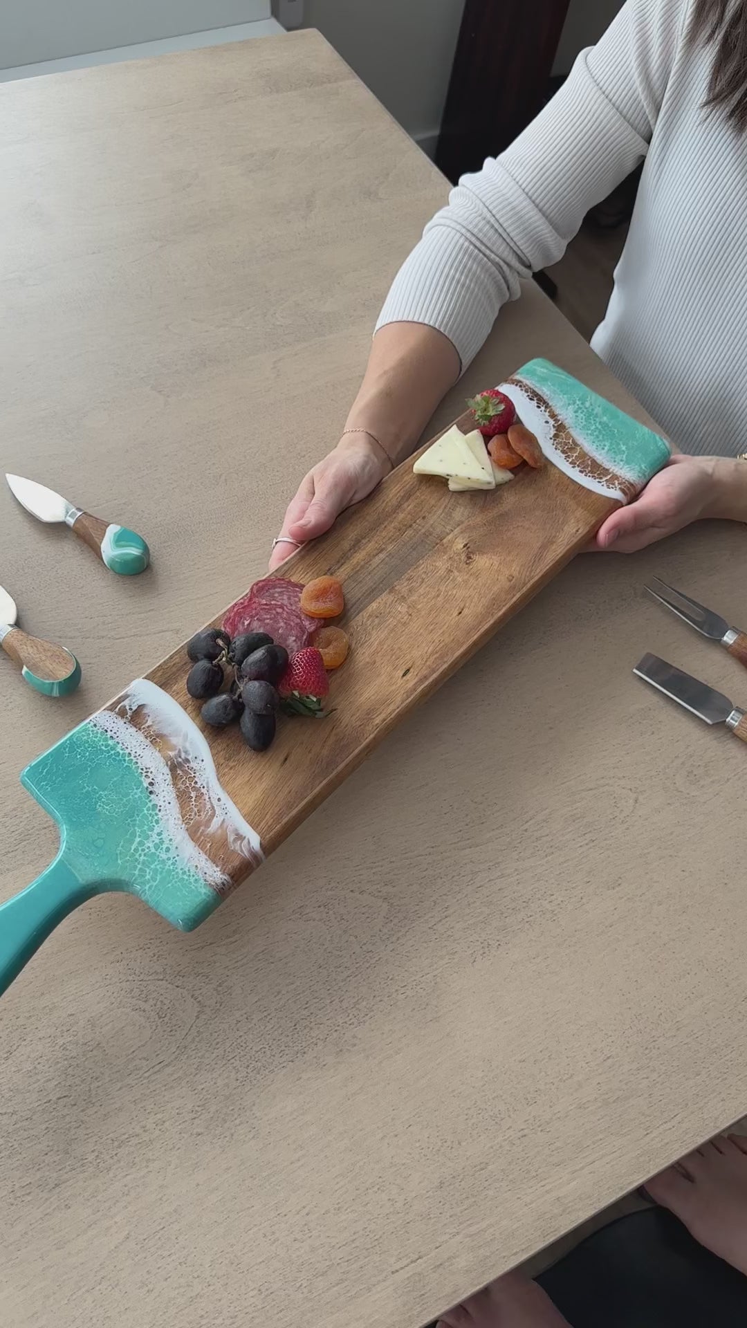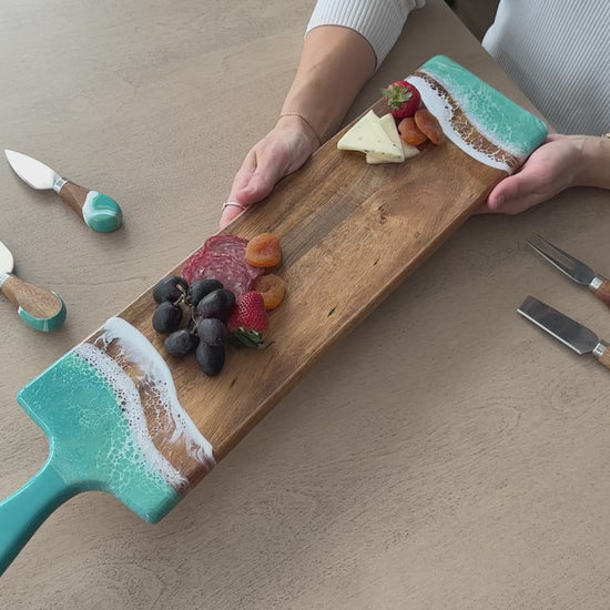 Here’s a great suggestion from one of our customers: If you want to use one of our cheese boards as a cutting board, use the back of the board for cutting and the front for serving. The resin portion could scratch if used for cutting.
