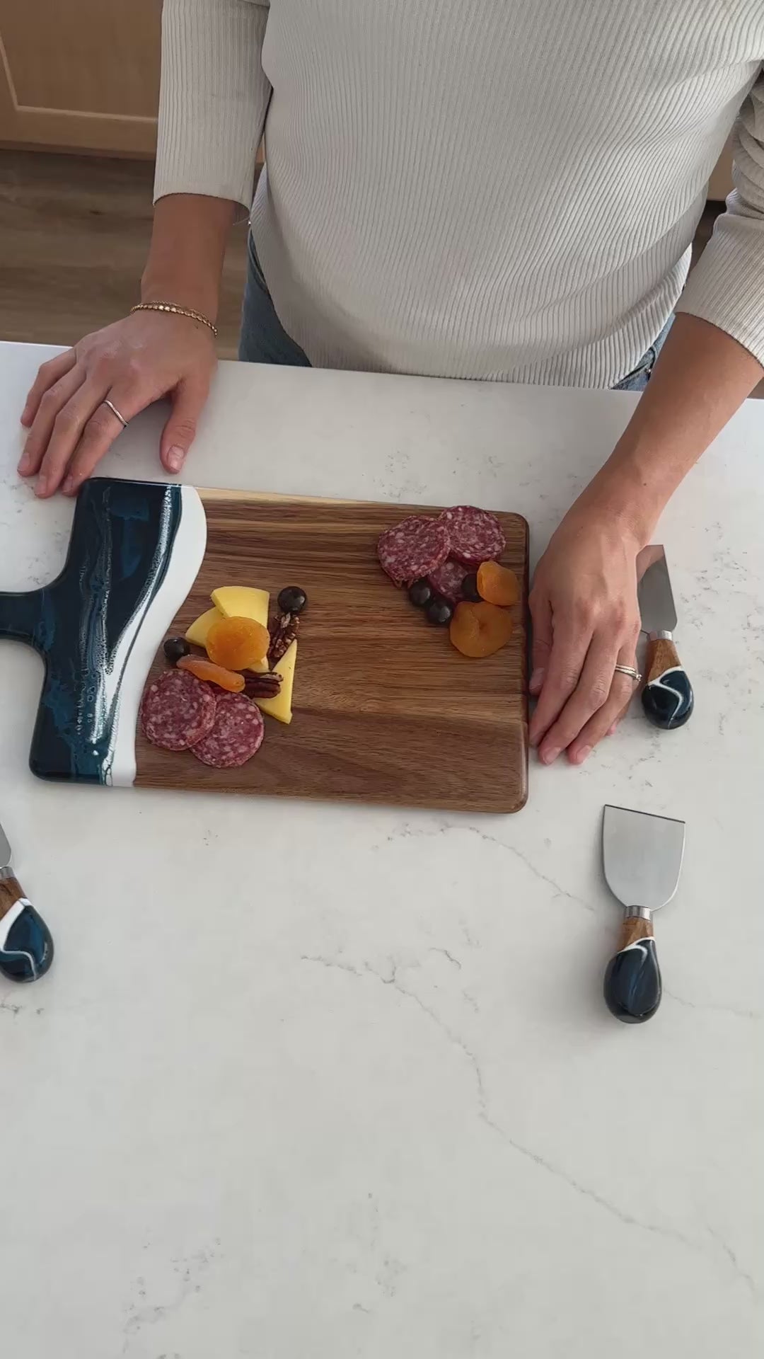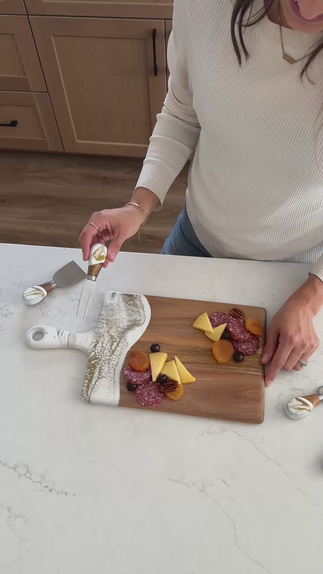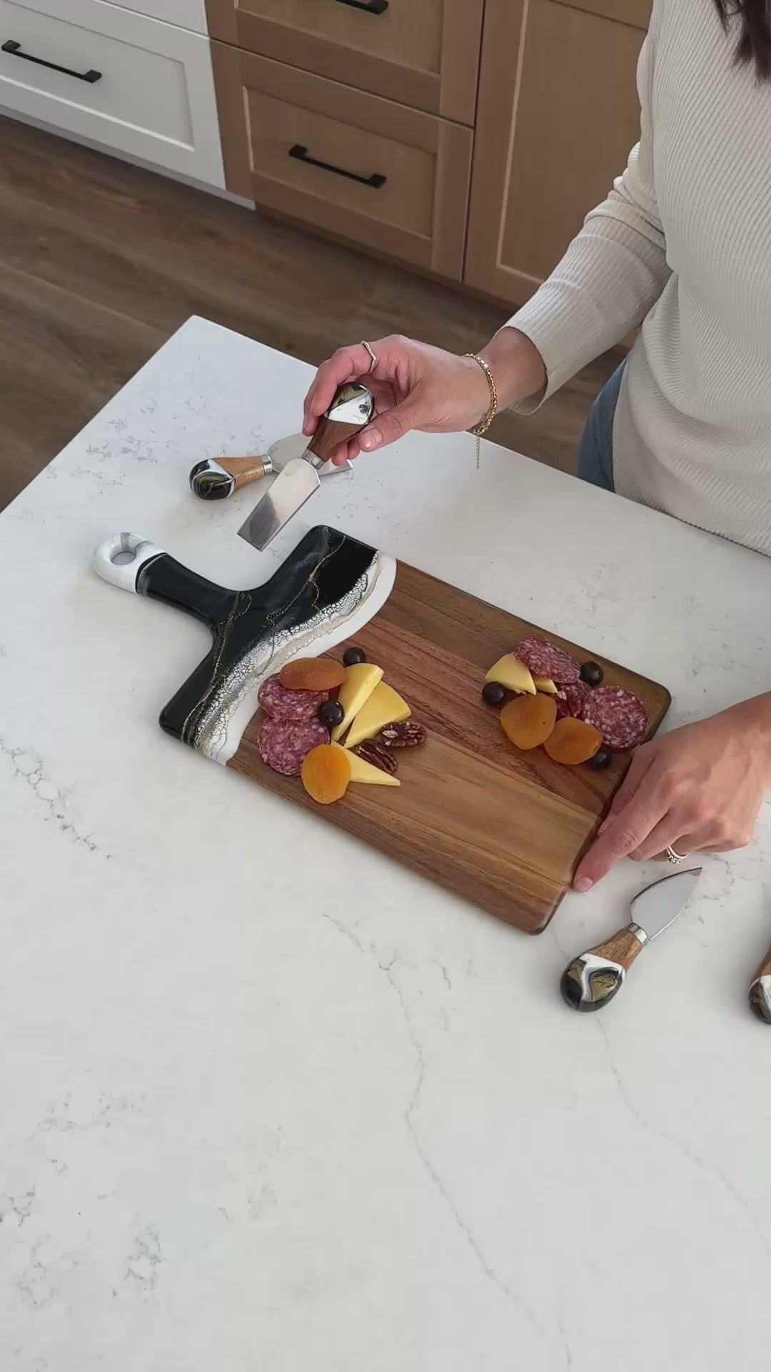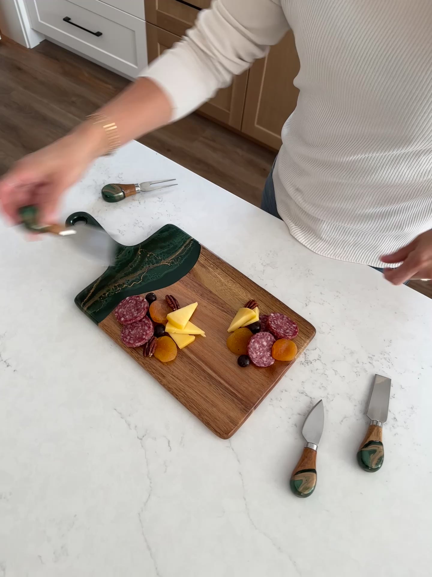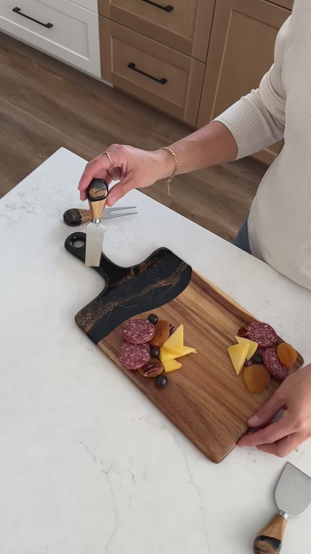I bought the cheeseboard for my niece who entertains a lot. When she opened the box, the look on her face was priceless. She said “I love love this cheeseboard” then promptly displayed it on the island in her magnificent kitchen. I wish I had thought to take a photo, but the cheeseboard matched the brushed gold handles on her cabinetry and the pure white with just a hint of marbleized gold in the kitchen island. So I’m pretty sure my Christmas gift was a hit! Now I want one!!