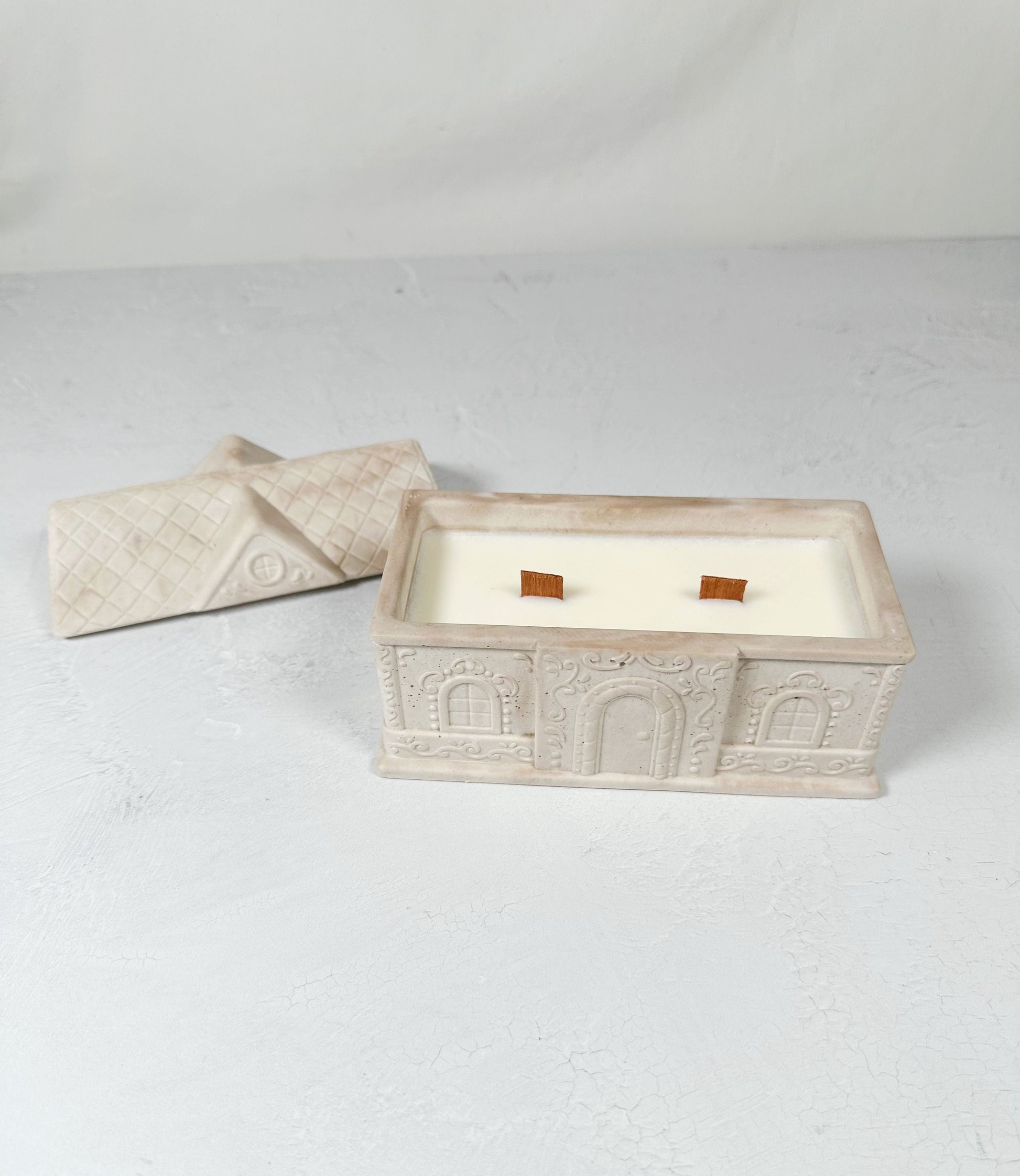 Introducing The Gingerbread House Candle — a festive stoneware candle that brings the magic of the holidays to life through cozy scent and nostalgic design. With its storybook silhouette, soft faux-stone texture, and delicately detailed roofline, this charming piece captures everything we love about the season — warmth, whimsy, and handcrafted beauty.
