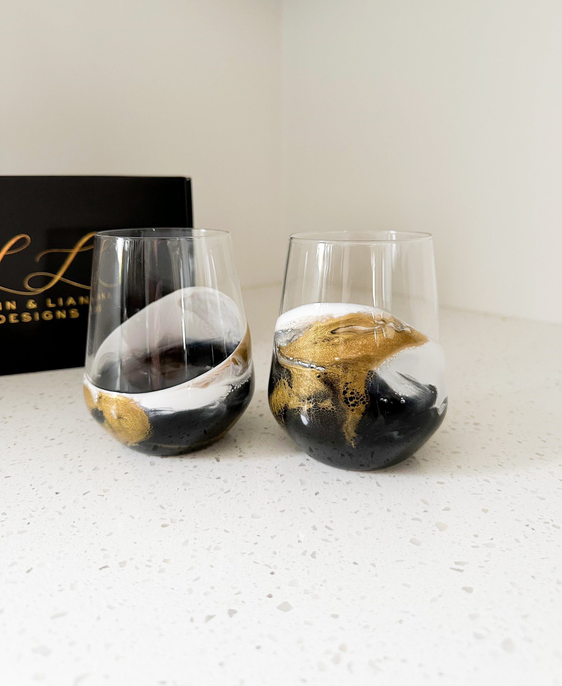 Lynn & Liana’s 15 oz entertaining glasses are one-of-a-kind pieces of functional art. Our in-house artists meticulously hand-design an eco-friendly resin accent on the outside surface of each item to create a stunning and unique design that will impress your guests. A definite conversation starter!