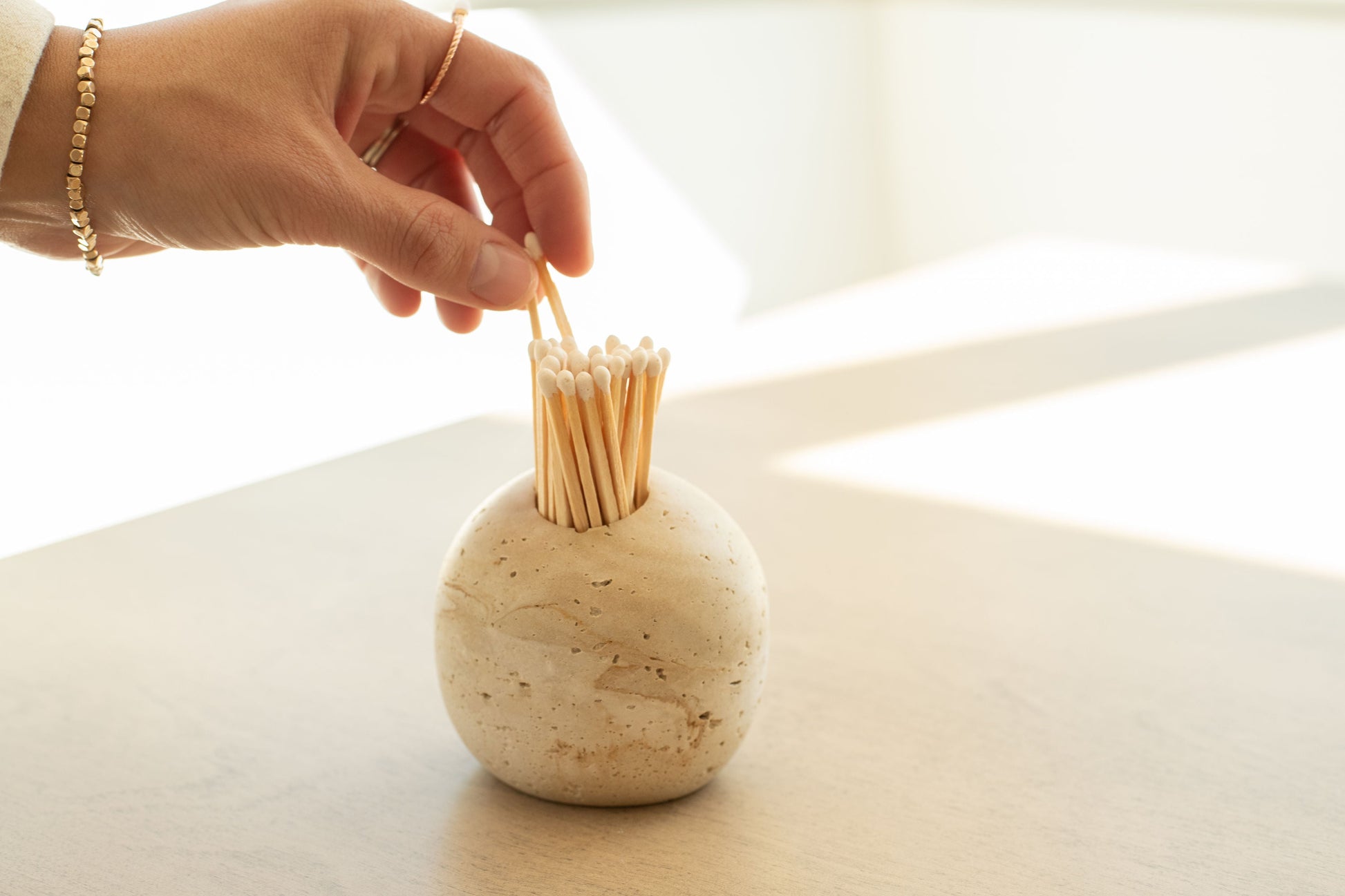 The travertine-inspired match holder features soft, creamy tones and subtle veining that mimic the natural warmth and elegance of real stone. Its light, neutral finish complements both minimal and layered interiors—perfect for styling counters, tables, or decor vignettes.